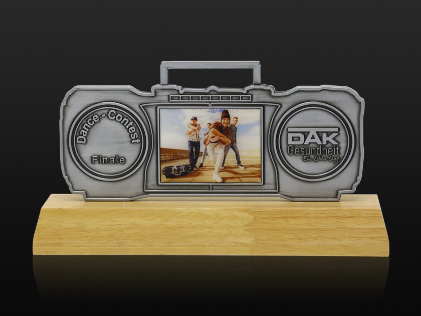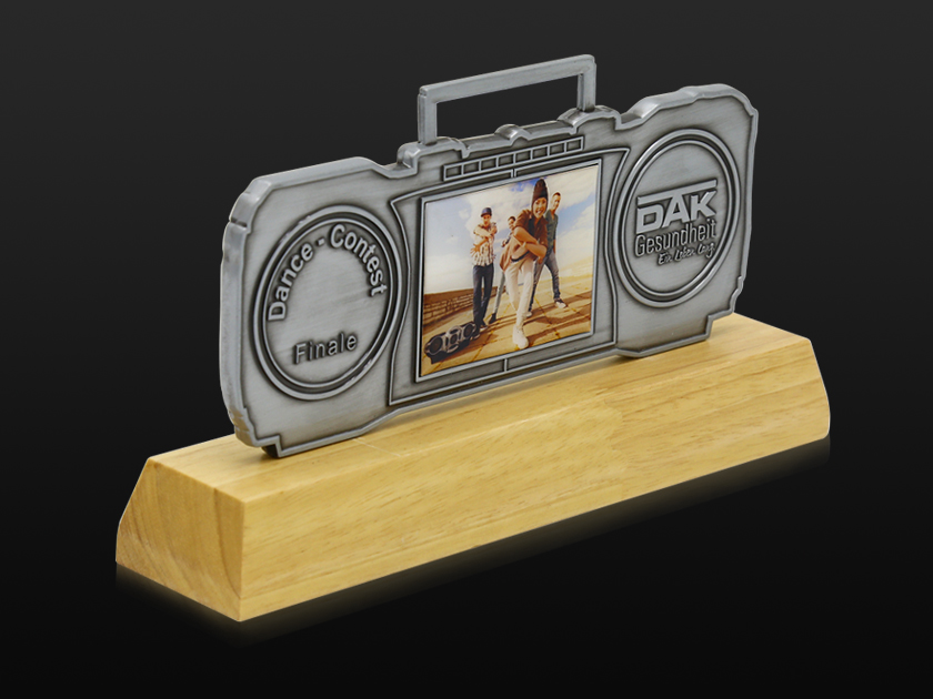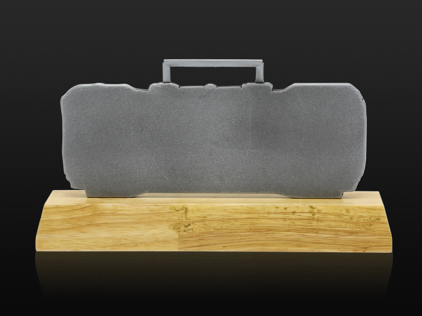 【制作工藝】:壓鑄 【上色工藝】:金屬本色 【電鍍顏色】:槍黑拉絲 【背面工藝】:砂底 【產(chǎn)品配件】:木底座